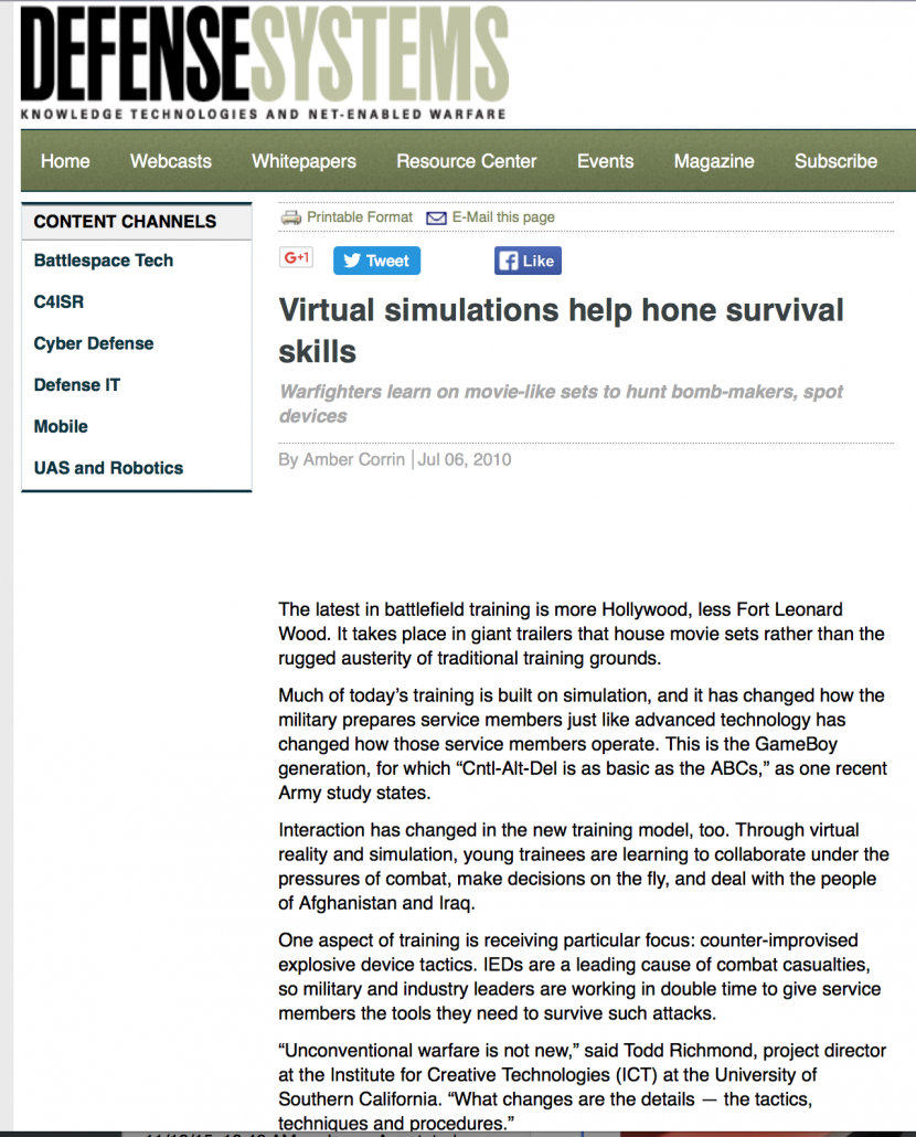 ICT is making strides in counter-IED training, partnering with the military and industry contractors to simulate combat environments. In ICT’s Mobile Interactive Counter-IED Trainer, movie set-inspired stages are housed in trailers that teams of trainees navigate. The trailers can be quickly deployed and set up almost anywhere.